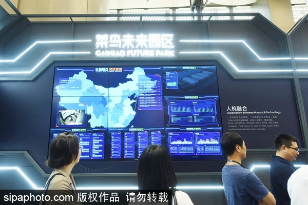 Visitors look at the smart logistics system developed by Alibaba Group, on the 2019 Global Smart Logistics Summit with the theme of "Digital Acceleration" opened in Hangzhou, Zhejiang province on May 28, 2019. [Photo/Sipa]