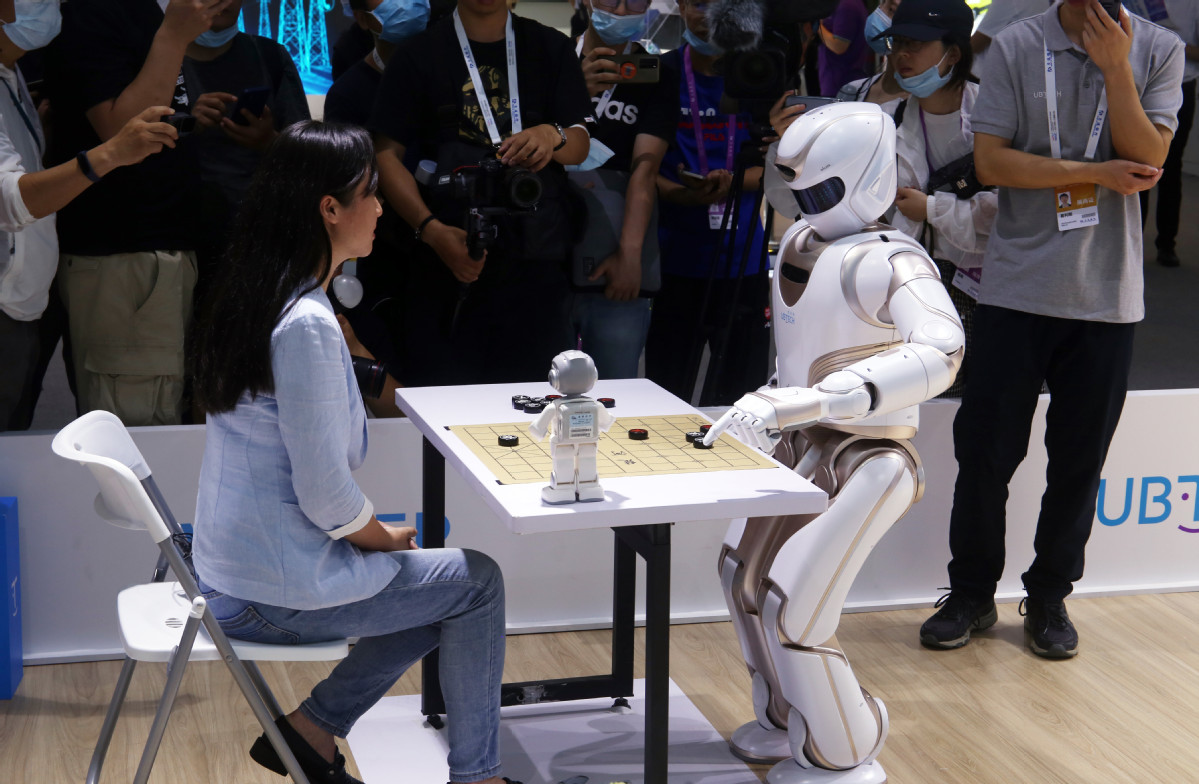 A woman plays Chinese chess with a robot at the World Artificial Intelligence Conference in Shanghai, on July 7, 2021. [Photo/IC]