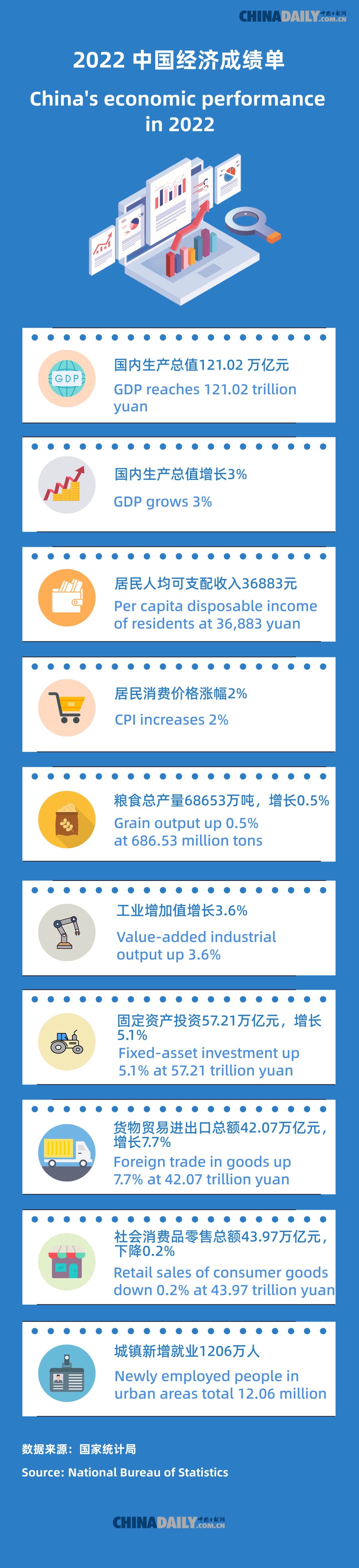 China's GDP growth reached 3 percent year-on-year in 2022, indicating that the Chinese economy has made new headway despite multiple headwinds, the National Bureau of Statistics said on Tuesday.