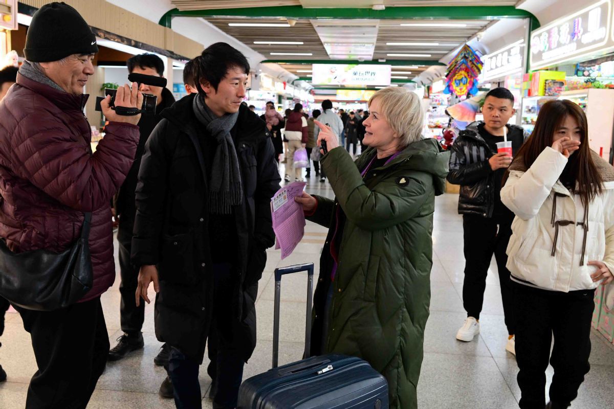 A Danish woman, searching for small goods, is interviewed by reporters at the Yiwu International Trade Market in Yiwu city, Zhejiang province, on Jan 15, 2025. [Photo by Shi Bufa/for chinadaily.com.cn]