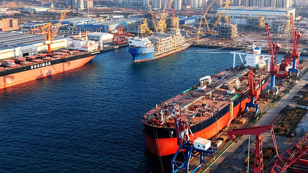 A bustling scene of production at the shipbuilding and repair site within the Haixi Bay Ship and Marine Engineering Industrial Base. [Photo/IC]